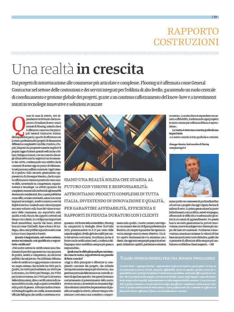 Flooring nell'inserto "Rapporto Costruzioni" del Corriere della Sera di settembre 2025: un riconoscimento del nostro impegno a migliorarci sempre. Il nostro BDM Giuseppe Messina racconta l'incessante crescita di Flooring degli ultimi anni: "Siamo una realtà solida che in quasi 50 anni di attività ha costruito la propria identità aziendale sui valori dell'integrità, dell'affidabilità, dello spirito di squadra, della qualità e del senso di responsabilità. Oggi la sfida è affrontare la complessità sempre crescente dei progetti, che richiedono un'organizzazione sempre più strutturata, una gestione puntuale delle risorse e un controllo attento di ogni fase operativa. Flooring ha saputo raccogliere questa sfida continuando a potenziare il proprio organico e a investire in soluzioni innovative, senza mai scendere a compromessi sulla qualità. Questo sforzo, unito alla capacità di rispettare gli impegni, ha creato rapporti di fiducia duraturi con i nostri clienti e ha consolidato la nostra reputazione. La prima generazione ha posto le fondamenta con serietà e sacrificio, affrontando le difficoltà e trasformando gli errori in occasioni di apprendimento. Su queste basi la seconda generazione ha elaborato la proiezione di Flooring nel futuro, spingendo sul rinnovamento e promuovendo una visione di mercato più ampia. Tradizione e iinovazione camminano insieme: la volotà di fare bene rimane il nostro tratto distintivo, quello che ci permette di sostenere prove sempre più ambiziose e soddisfare clienti sempre più preparati ed esigenti."